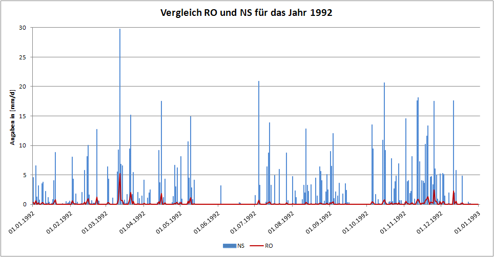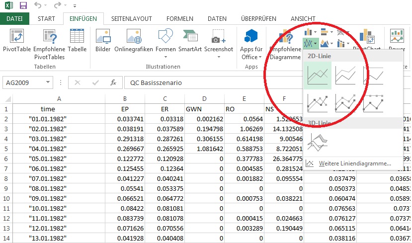 Wenn die Rechnung beendet ist, öffnen Sie den Ordner Results. Dort finden Sie Ihren zuvor benannten Ergebnisverzeichnisordner (z.B. Basisszenario). Wenn Sie diesen öffnen, finden Sie den Ordner zeit.dat, der den Ordner Tag enthält. Dort finden Sie die Ergebnisse. Öffnen Sie die Tabellen mit Excel. Erstellen Sie für die potentielle Verdunstung (EP), reale Verdunstung (ER), Grundwasserneubildung (GWN), den Landoberflächenabfluss (RO) und Gesamtabfluss (QC) jeweils ein Diagramm, indem Sie die Tabelle markieren und auf den Diagramm-Assistenten klicken: Ergebnisse in Excel. Zum direkten Vergleich können Sie die potentielle und reale Verdunstung in einem gemeinsamen Diagramm darstellen. Sie können auch den Niederschlag NS (Datei: geb_mit.pi) mit auftragen. Achten Sie darauf, dass Sie die gleichen Zeiträume sowie die gleiche Skalierung der y-Achse für die Diagramme wählen, damit ein Vergleich zwischen den einzelnen Diagramm möglich ist: Diagramm in Excel. Sie können auch für eine bessere Übersicht eine neue Excel-Tabelle erstellen und die Ergebnisse für einen bestimmten Zeitraum hineinkopieren.