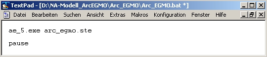 Sie können auch den einfachen Weg wählen und zum Starten von ArcEGMO auf die Batch-Datei ARC_EGMO.bat doppelklicken (D:/NA-Modell_ArcEGMO\ArcEGMO\ARC_EGMO.bat)!