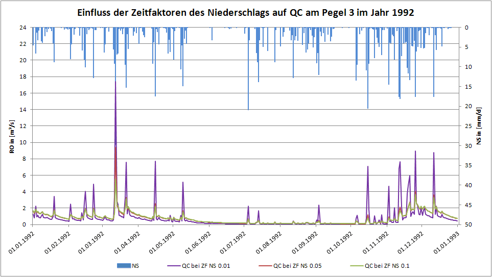 Wie und warum wirkt sich der Zeitfaktor Niederschlag auf den Gesamtabfluss QC aus? Betrachten Sie dafür die Wasserhaushaltsgrößen EP, ER, GWN und RO. Stellen Sie das Ergebnis in einem Diagramm dar.