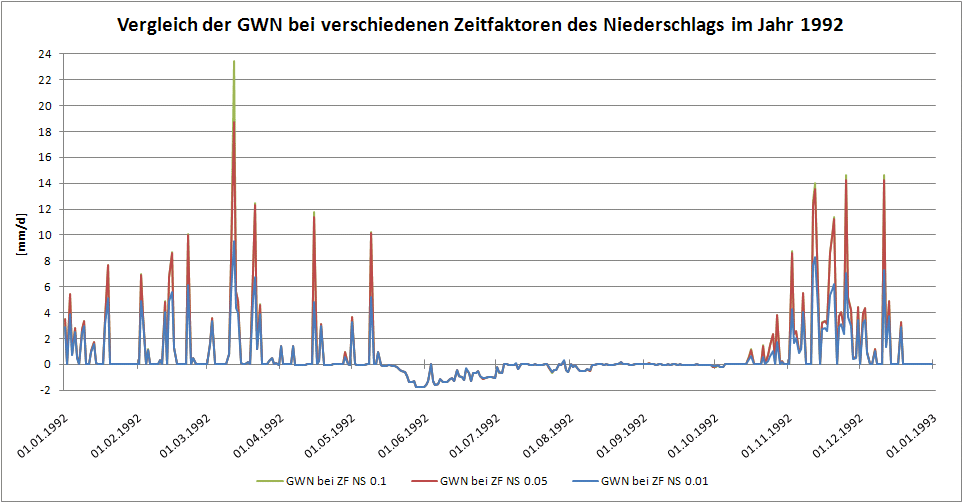 Abbildung 4‑2: Darstellung der Grundwasserneubildung bei unterschiedlichen Zeitfaktoren für den Niederschlag