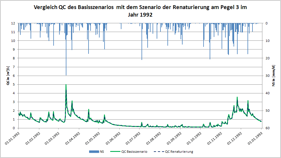 Abbildung 8‑1: Vergleich der Abflussmengen des Renaturierungs‑ mit dem Basisszenario