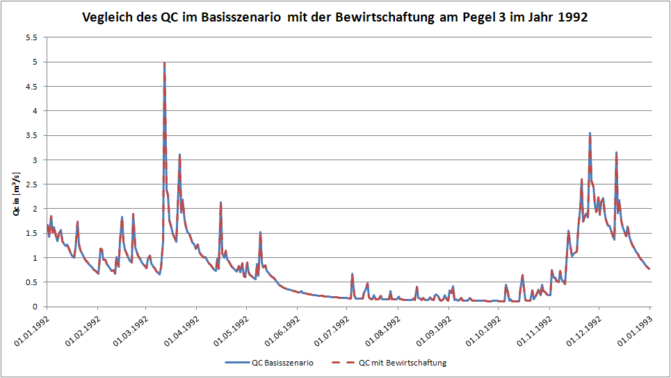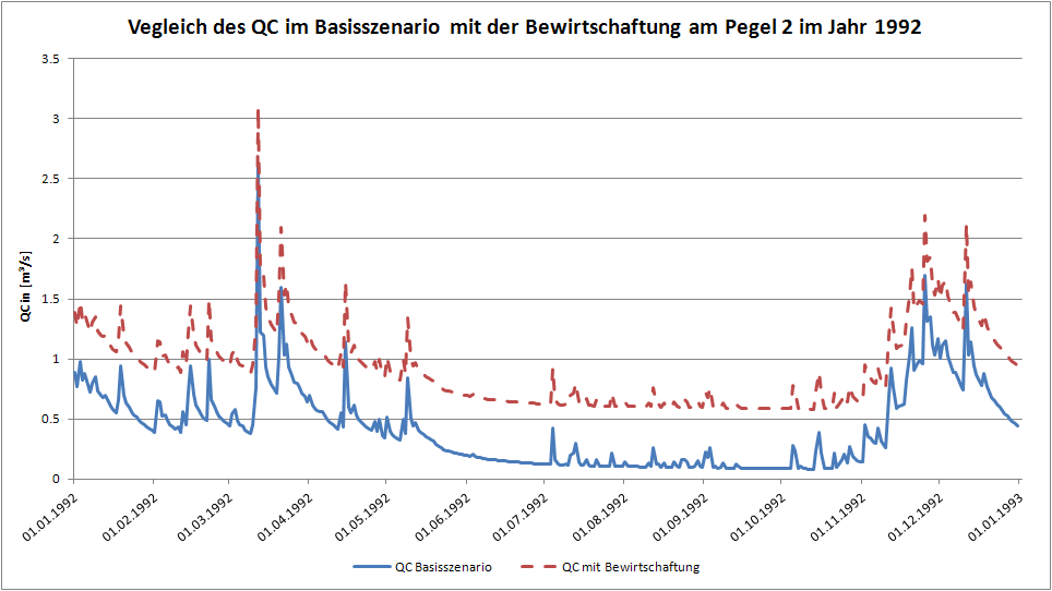 Speichern Sie die beiden erstellten .qex-Dateien unter: D:\NA-Modell_ArcEGMO\Zeit.dat\bw_data. Ändern Sie für die Rechnung in der arc_egmo.ste den Namen der Berechnungsvariante und speichern Sie diese Datei. Führen Sie die Rechnung wie gehabt durch. Vergleichen Sie den Gesamtabfluss der 3 Pegel des Bewirtschaftungsszenarios mit dem des Basisszenarios. Zur Auswertung nutzen Sie den räumlichen Überblick Übersicht Bewirtschaftung.