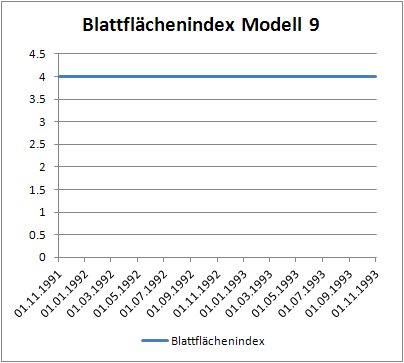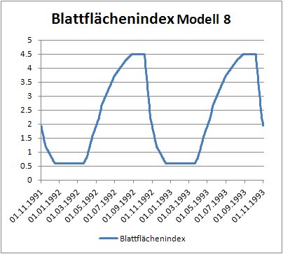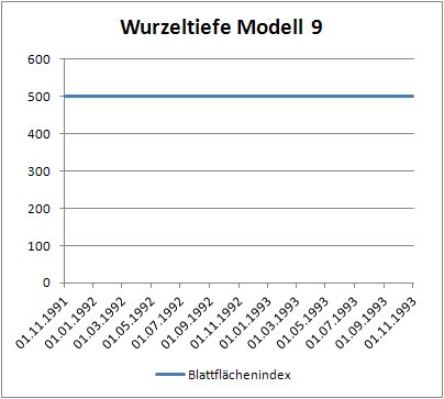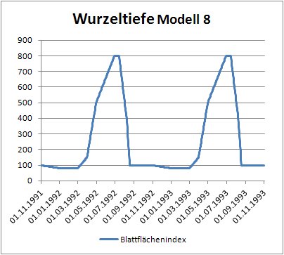 Öffnen sie nun die Landnutzungstabelle und stellen sie in der Spalte Modell für die Zeile mit der Bezeichnung „Ackerland“ das Vegetationsmodell von 9 auf 8 um. Speichern sie ihre Veränderung, geben sie in der arc_egmo.ste eine neue Berechnungsvariante (z.B. VegModell2) ein und starten sie die Simulation. Erstellen sie wieder zwei Diagramme für die Wurzeltiefe und den Blattflächenindex (01.11.1991 - 01.11.1993) und speichern sie ab.