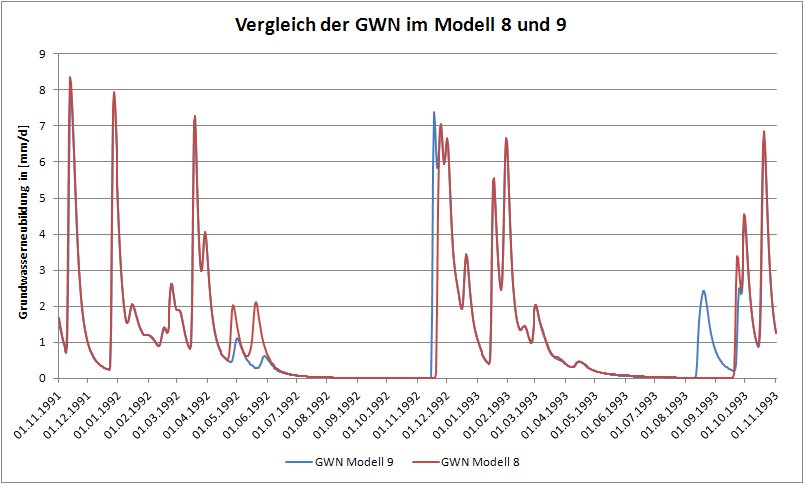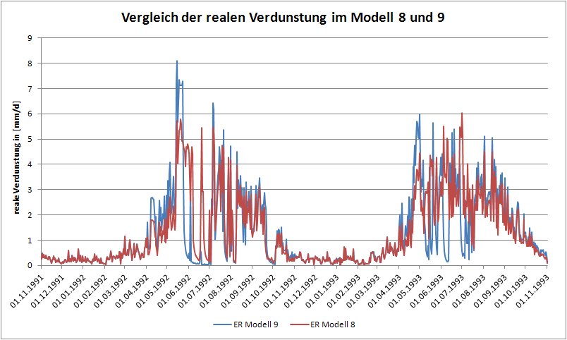 Im Folgenden wollen wir uns die Auswirkungen der Modellumstellung auf die reale Evapotranspiration und die Grundwasserneubildung ansehen. Erstellen sie für beide Ausgabegrößen ein Diagramm mit jeweils einer Kurve für die Simulation mit Vegetationsmodell 8 und 9. Beschränken sie sich hier wieder auf den Zeitraum 01.11.1991 – 01.11.1993. Die Dateien der Zeitreihen der simulierten Evapotranspiration (efl_sum.er) und der Grundwasserneubildung (efl_sum.gwn) finden sie in dem Ordner zeit.dat -> tag in ihren Results-Ordnern „VegModell“ und „VegModell2“. Vergleichen sie die beiden Ausgabegrößen. Welche Unterschiede können sie erkennen?