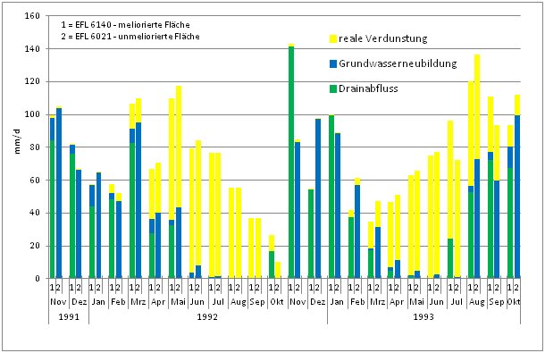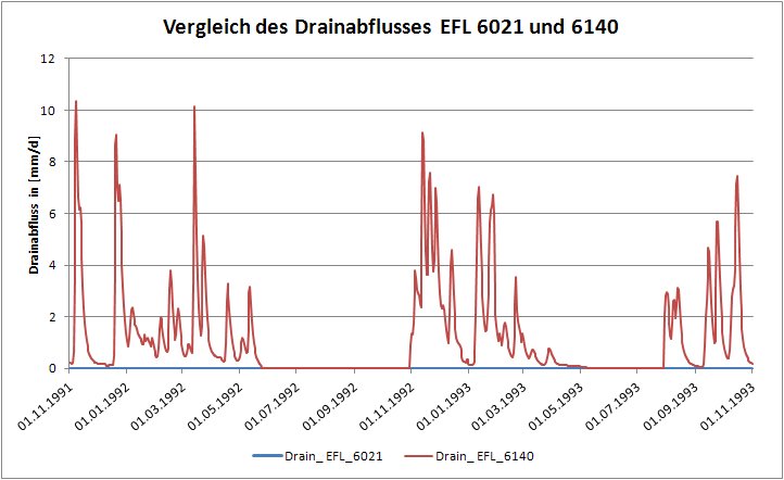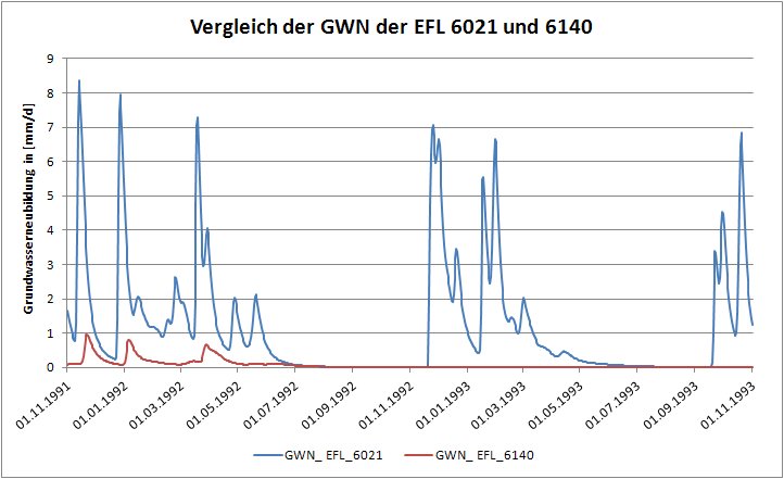 Erstellen sie ein neues Diagramm, in dem sie die Grundwasserneubildung der EFL 6021 (simuliert mit Vegetationsmodell 8 - results-Ordner: VegModell2) und der EFL 6140 betrachten. Vergleichen sie nun die beiden Kurven. Wie können sie sich den unterschiedlichen Verlauf erklären? Sehen sie sich hierzu die Ausgabegrößen reale Verdunstung (efl_sum.er), Mischkanalisationsabfluss (efl_sum.mkr), Trennkanalisationsabfluss (efl_sum.tkr), Hypodermischer Abfluss (efl_sum.inter) und Drainabfluss (efl_sum.drain) für beide Flächen an. Sie finden sie unter zeit.dat/Tag der jeweiligen results-Ordner. Erstellen sie ein weiteres Diagramm, das den Drainabfluss der beiden EFL beinhaltet und vergleichen sie den Verlauf mit dem der Grundwasserneubildung.