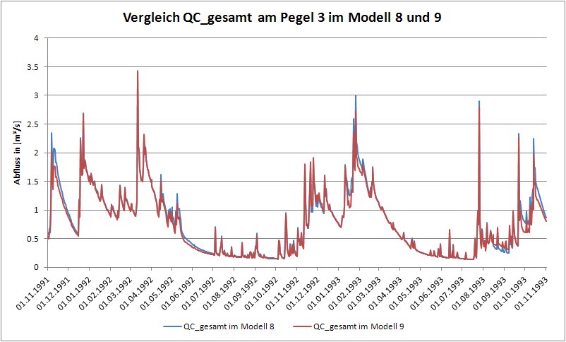 Nachdem wir am Beispiel von Einzelflächen den Einfluss der verschiedenen Vegetationsmodelle auf den Bodenwasserhaushalt untersucht haben, wollen wir zum Abschluss den Einfluss auf den simulierten Abfluss für das Gesamteinzugsgebiet betrachten. Beachten Sie, dass in unserem Beispiel lediglich eine Zeitfunktion für den Landnutzungstyp „Ackerland“ vorhanden ist. Die Modellierung mit Vegetationsmodell 9 ist daher auch nur für Elementarflächen dieser Landnutzung möglich. Für eine Modellierung aller Elementarflächen des Gesamteinzugsgebietes mit Modell 9 müssten weitere Zeitfunktionen eingefügt werden. Da Ackerland allerdings den größten Flächenanteil in unserem Projekt einnimmt, ist der Einfluss der verschiedenen Vegetationsmodelle auf den Gebietsabfluss auch so interpretierbar.